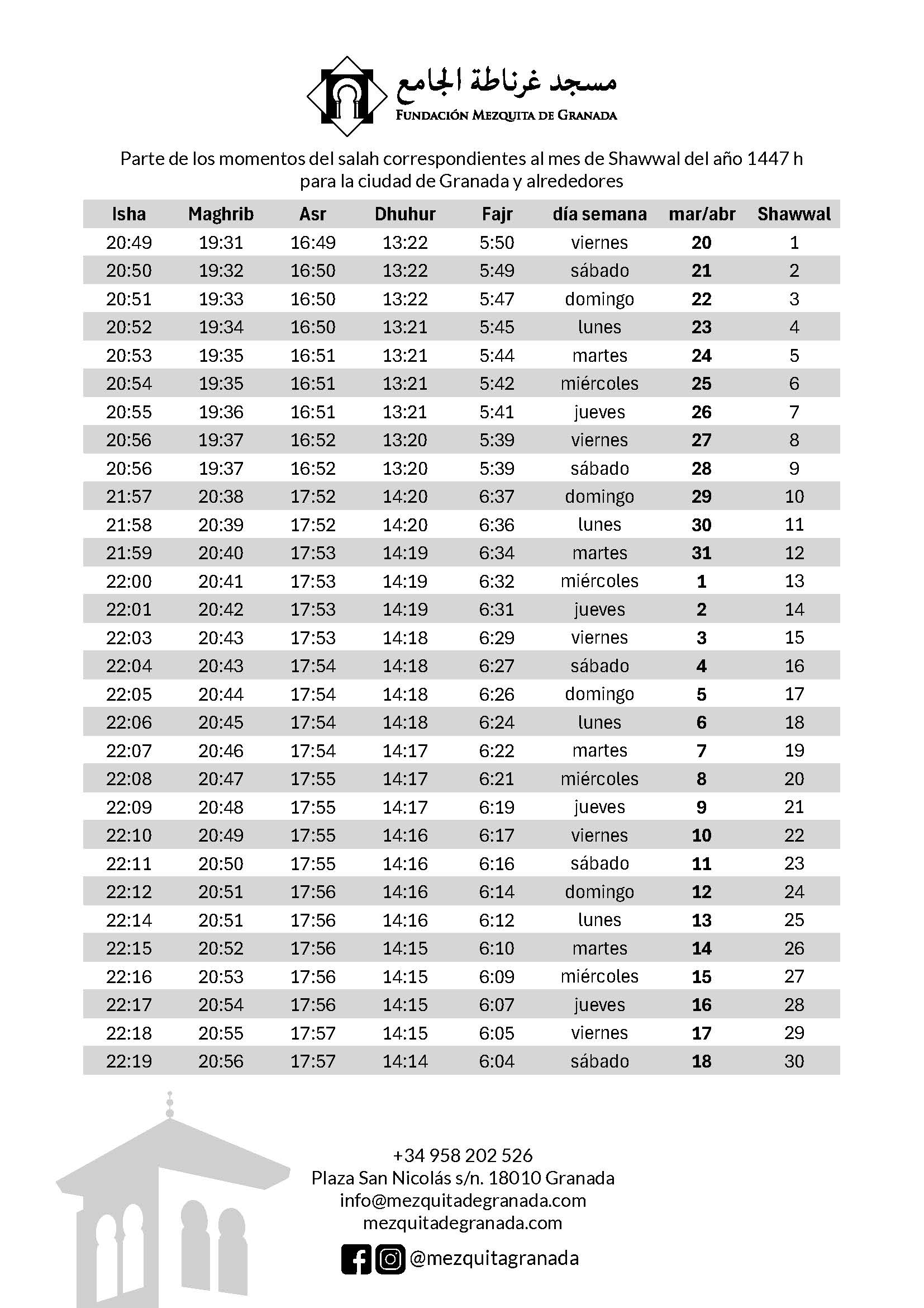 El Yumu’ah comienza con el Jutbah a las 14:30 h durante todo el año.